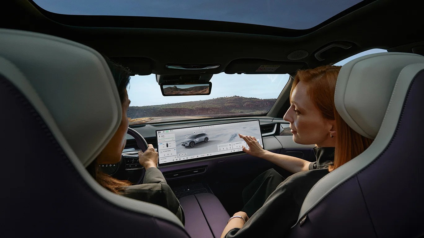 Ačkoliv zvenčí může Mazda CX-6e působit odvážně a tvrdě, jakmile nastoupíte na palubu vozu, dýchne na vás pohodlí spojené s moderním designem. Horní přístrojový panel a velký 26,45” 5K displej působí, jako by se v interiéru skoro až vznášely. Tyto displeje jsou vybaveny automatickým stmívacím senzorem a ultra nízkou odrazivostí, díky čemuž jsou snadno čitelné v každé situaci.